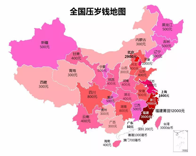 年前,有媒體總結(jié)出了一張壓歲錢地圖,全國(guó)各地每個(gè)孩子每年收到的壓歲錢額度有明顯的地域差別。