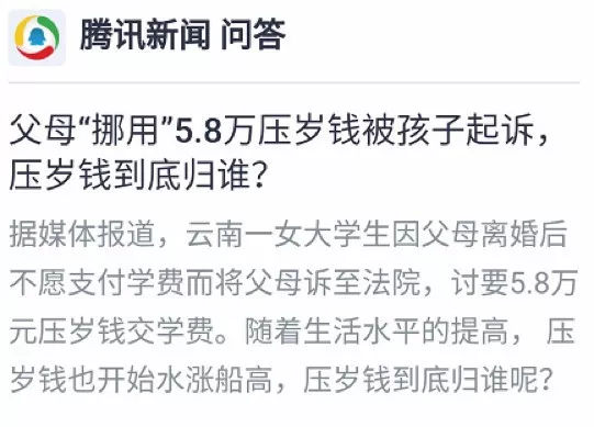 最終法院判決父母以每月支付該女學(xué)生一定數(shù)量的生活費(fèi)的方式,來歸還挪用的壓歲錢。這也使得大家首次以法律的視角,去審視壓歲錢的使用。