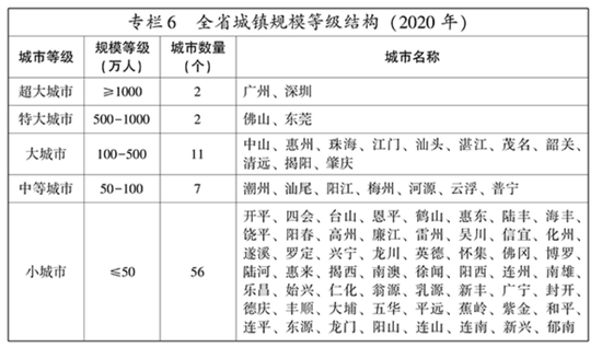 在《規(guī)劃》中的“全省城鎮(zhèn)等級(jí)結(jié)構(gòu)(2020年)表格”顯示,到2020年,全省超大城市、特大城市各有兩座。其中超大城市為廣州、深圳。而特大城市為佛山、和東莞,規(guī)模等級(jí)為500萬人-1000萬人。