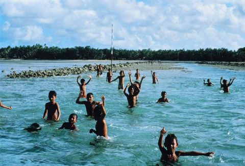 圖瓦盧屬熱帶海洋性氣候。年平均溫度29℃,溫差小。3~10月為旱季,11月至次年2月為雨季。年平均降水量3000毫米。而這里的人們一般的娛樂項目就是游泳。圖為圖瓦盧的小孩正在游泳。