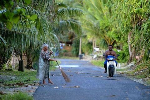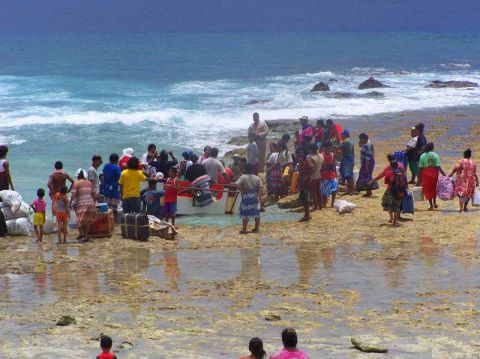 圖瓦盧地理位置偏遠,土地狹小,且無良好深水港,故海空運交通均極為不便。圖為正在等待輪船的人們。