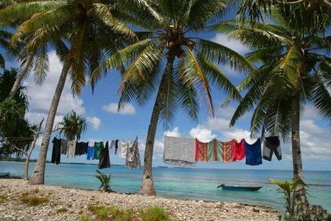 而且因為生態環境保持的非常好,所以說這里的景色非常的迷人。但是因為它地處遙遠所以每年只有少數旅客到達。圖為當地的居民將衣物晾在椰樹上。