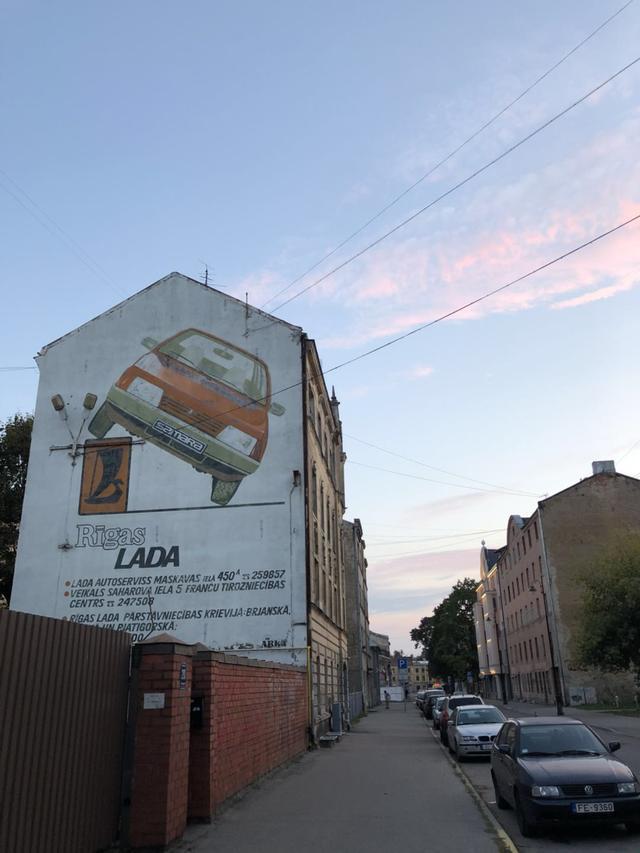 當夜幕降臨時,在街上行走就像是一種沮喪。路邊的墻也畫了這輛前蘇聯的拉丁美洲車,不知道它是真正的廣告還是諷刺。