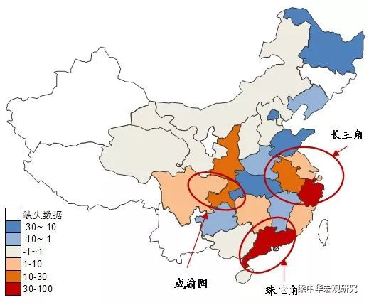 注2:吉林、云南、西藏暫未公布數(shù)據(jù);新疆人口變動(dòng)暫不考慮;山西省常住人口為推算數(shù)據(jù),非抽樣調(diào)查,因此計(jì)得人口流動(dòng)為0,不能反映實(shí)際情況,故剔除不考慮。