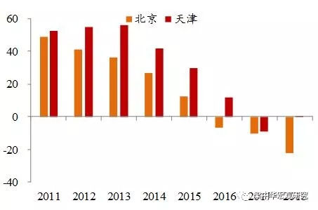 圖表:2011年來北京和天津人口凈流入(萬人)
