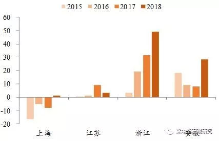 長三角城市群整體仍在大幅凈流入,但內(nèi)部格局也在分化。浙江人口流入繼續(xù)領(lǐng)跑,安徽成最大“黑馬”。而反觀上海和江蘇兩地,上海由于控制人口總量,15-17年人口持續(xù)外流,盡管18年人口呈現(xiàn)凈流入,但規(guī)模也僅有1萬人;而江蘇的人口凈流入規(guī)模近幾年一直不大,而且已經(jīng)連續(xù)6年人口凈流入量少于安徽。前些年安徽人口主要流向了上海、江蘇和浙江,而現(xiàn)在安徽人口出現(xiàn)回流跡象,這三大流入地可能會(huì)受到一定影響。