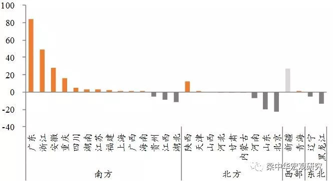 圖表:南北方各省市人口流動(dòng)分布(萬人)