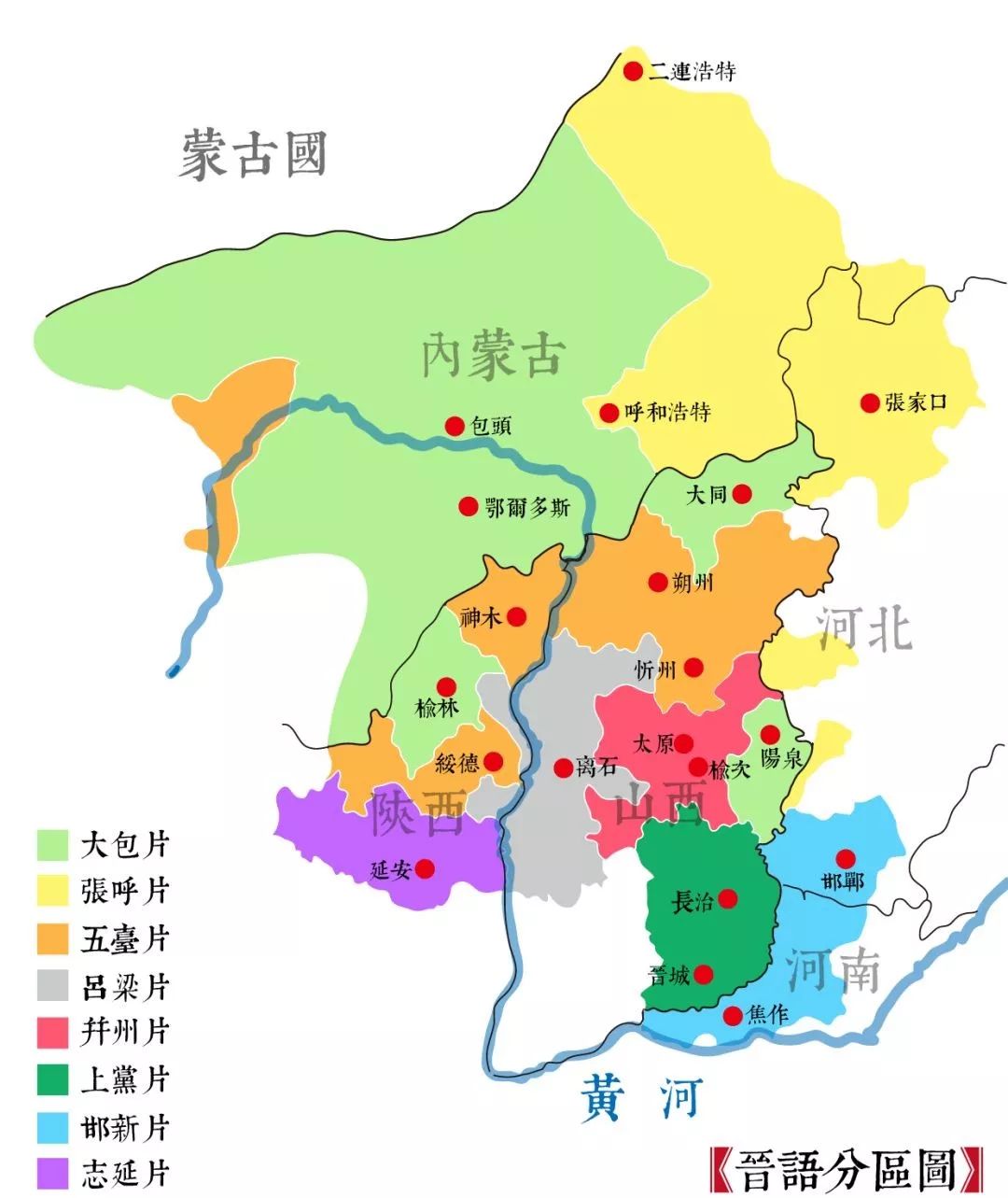 晉語是覆蓋山西大部、陜西北部、內(nèi)蒙古中部的主要方言,包頭、鄂爾多斯和山西大同、陜西榆林同屬晉語方言的“大包片”;首府呼和浩特則屬晉語方言的“張呼片”。