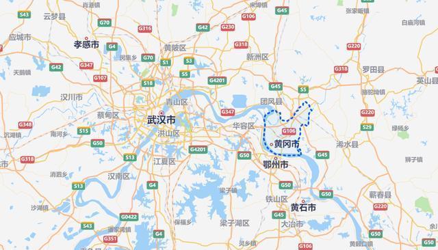 下面就是武漢市區與黃岡市黃州區的位置關系。