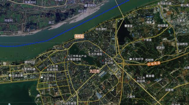 下面是江西省九江市的市區,可以看到九江火車站的位置,它位于九江市的中間,隔著長江就是黃梅縣。