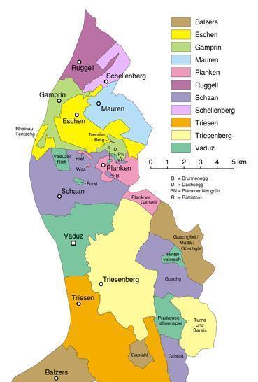 下面是列支敦士登的行政區(qū)劃地圖——每種顏色的就是一個市鎮(zhèn)。