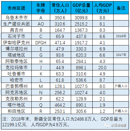 新疆各地民用車牌字母代碼排序與經濟實力對比,烏魯木齊是吻合的,其地區生產總值(即GDP總量)全省第一,且遠超其他區州市,人均地區生產總值(即人均GDP)也不錯,居第二位。所以,烏魯木齊無疑是全區實力最強的市;昌吉州的地區生產總值(即GDP總量)排第三,人均地區生產總值(即人均GDP)也排是全區第三,綜合經濟實力不錯,車牌字母排在第二位基本跟經濟實力吻合;伊犁哈薩克州人均雖然不高,但地區生產總值(即GDP總量)排第二,僅次于烏魯木齊,車牌字母排序與經濟實力基本吻合。和田地區的地區生產總值(即GDP總量)排倒數第三,人均地區生產總值(即人均GDP)倒數第一,綜合經濟實力最弱,與車牌字母代碼排在最后吻合。