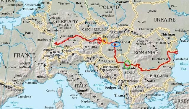 ▲多瑙河流域示意圖,包括眾多沿岸國家的首都(維也納,布拉迪斯拉發,布達佩斯和貝爾格萊德)都在河流沿岸