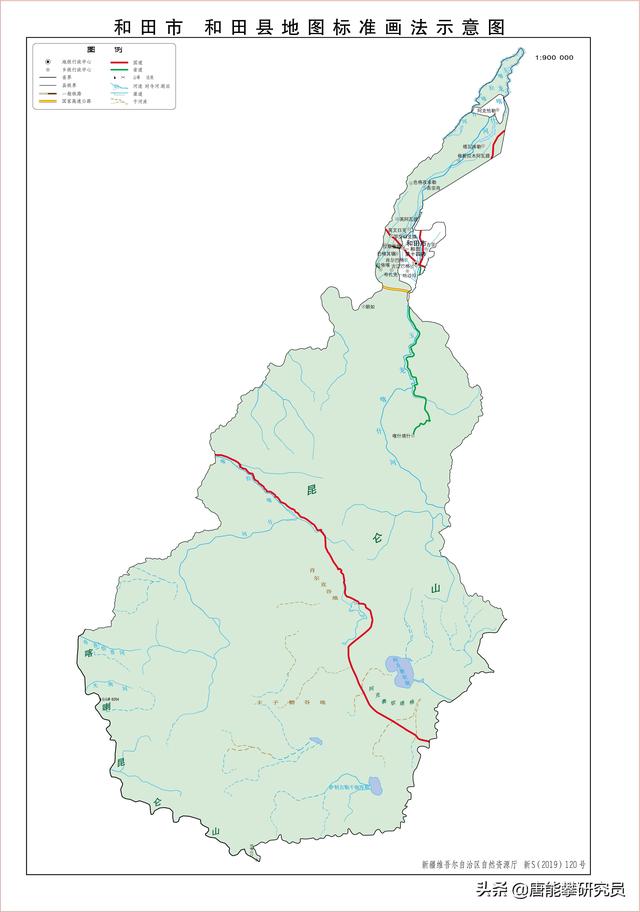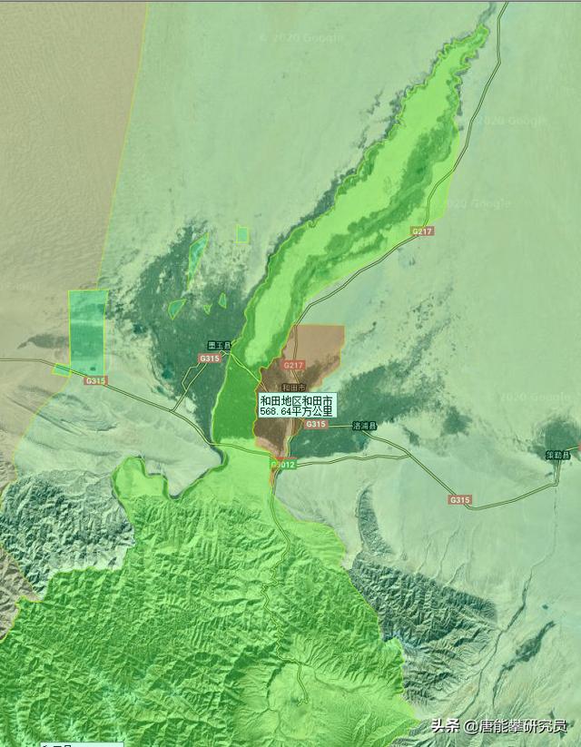 和田縣,上圖中的深綠色,約4.1萬平方公里,被和田地區皮山縣、墨玉縣、洛浦縣、策勒縣、和田市以及阿里地區的日土縣包圍,與克什米爾印度實控區接壤。