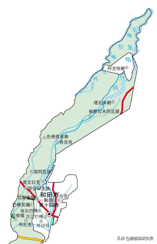 最后看一下和田縣與和田市的交通,國道580通往庫車市,國道315東西分別連接青海和喀什,高速公路和南疆鐵路都從喀什通到和田,但是向東到于田縣、民豐縣的延長線尚未建成。
