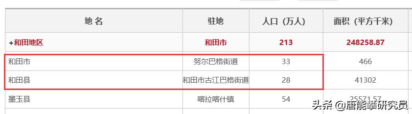 前面已經涉及到和田市與和田縣的土地數量,即土地面積,和田縣為4萬多平方公里,和田市為400多平方公里,和田縣粗略為和田市的100倍。