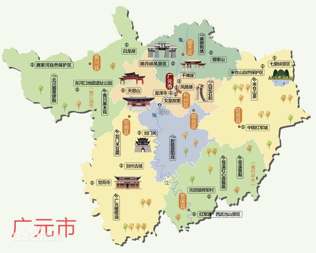 廣元境內(nèi)物產(chǎn)豐富、風(fēng)景秀美,擁有眾多的名勝古跡和游覽景點。