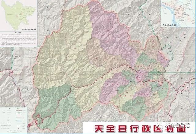 西部有二郎山、馬鞍山等。東部為低山河谷地帶。天全河納12條支流西東向橫貫縣境。建有喇叭河自然保護區。農產玉米、稻、小麥、油菜籽、豆類、蟲草、貝母、赤芍、天麻、杜仲等。所產天全牛膝、“金尖”邊茶、香谷米、獼猴桃著稱。有煤、硫鐵礦、大理石、鋁土等礦。工業有采礦、木材加工、水泥、化工、機修、制茶等。川藏公路橫穿縣境。城廂鎮西有古禁門關隘,老場鄉有紅軍醫院及紅軍大學遺址。