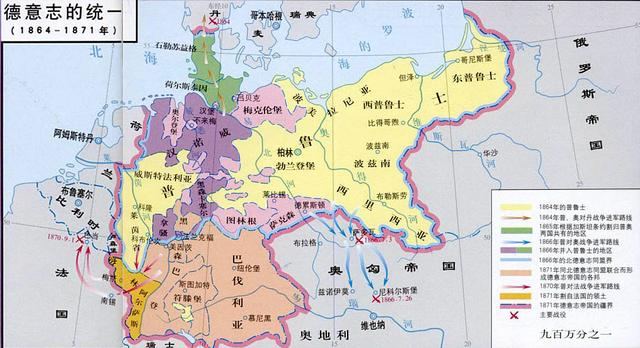 1848年德國(guó)各地爆發(fā)革命,普魯士邦的首相俾斯麥于1864年聯(lián)合奧地利擊敗丹麥,收回北方被丹麥占領(lǐng)的土地;1866年的“七星期戰(zhàn)爭(zhēng)”中擊敗奧地利,次年建立北德意志邦聯(lián);1870年發(fā)動(dòng)普法戰(zhàn)爭(zhēng),德國(guó)南部多個(gè)邦脫離法國(guó)統(tǒng)治,1871年完成了德意志統(tǒng)一并建立了德意志帝國(guó)。