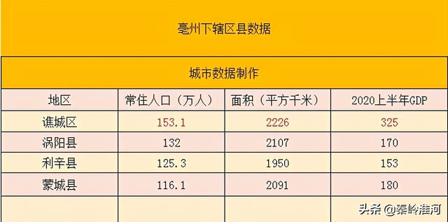 安徽亳州市下轄區(qū)縣數(shù)據(jù)——譙城區(qū)第一,利辛縣第四