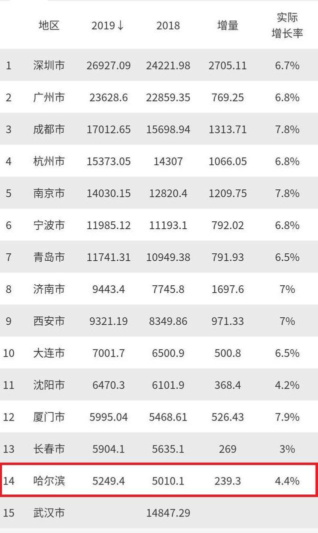 從以上的表格中可以看出,哈爾濱市的GDP總量是5249.4億,在中國15個副省級市當中,排名最后一位,也就是第15位。