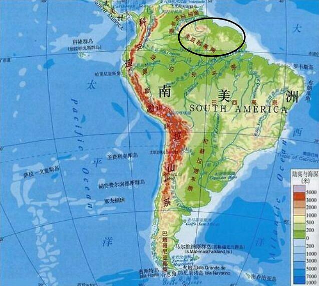 上圖_ 南美洲地形圖,標注處為圭亞那高原
