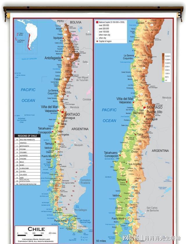 這是因為智利版圖非常狹長,南北長約4300公里,越南加上挪威的長度都不如智利長,而東西平均只有180公里,長寬比例達到了24比1。由于版圖過于狹長,給智利的地圖繪制帶來了很多困擾。因為如果只繪制智利全圖,紙張都要特別長,基本都是長寬一比八的紙張,如果印在傳統五比四的紙張上,那就根本看不清。所以經過不斷的修改,智利采用了把地圖一分為二的方式,一面繪制全圖,一面繪制重點地區細節圖,但即便如此,智利版圖仍然略顯苗條,兩側空余部分過大,也不美觀。所以智利便將阿根廷版圖畫進去,起到了充實地圖的作用。不過和越南畫鄰國不同,智利畫阿根廷,并沒有描彩上色,只是暗色,這就表示,阿根廷只起到了陪襯作用。所以越南和智利都喜歡畫進鄰國,但原因并不相同。