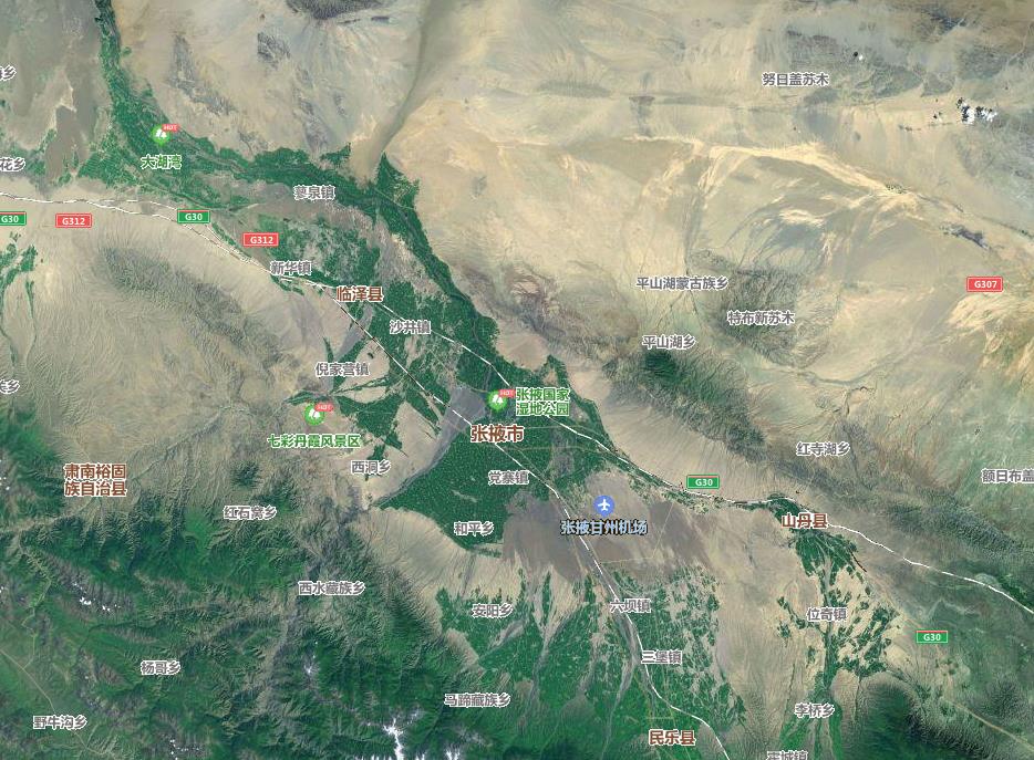 有這樣一個說法“金張掖、銀武威”,為啥張掖是金的呢?是因為張掖地下水資源儲量豐富的緣故。因為張掖有黑河水灌溉,使得張掖土壤肥沃,物產(chǎn)豐饒,成為全國重點建設(shè)的商品糧基地之一。從下面這張地圖上看,張掖也是整個河西五市綠色覆蓋范圍最大的城市。