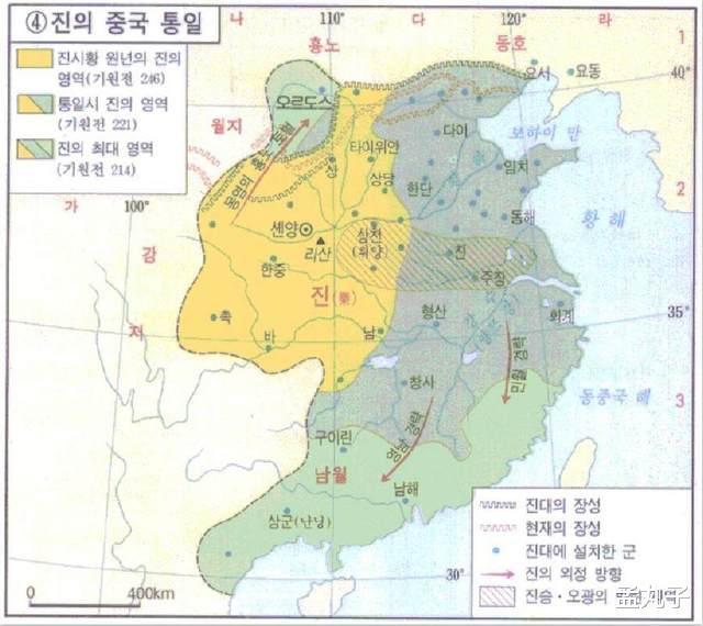 不過韓國在秦朝的地圖上用不同顏色劃分出,秦朝征戰他國,收復的領土。