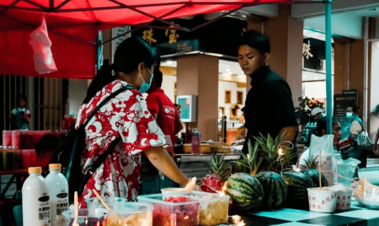 這里有各種小吃聚集地的集市,屬于大排檔氛圍,甘英泡雞腳、緬甸泡魯達、撒撇等等。水果眾多,榴蓮、牛油果,讓你實現水果自由,鮮榨果汁也非常好喝。
