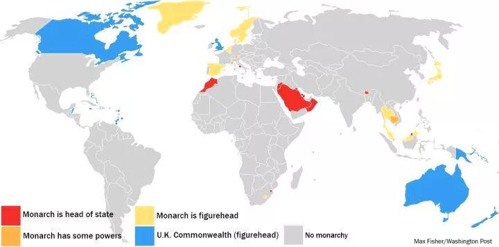 紅色:君主為國家元首 ;深黃:君主有一定國家權(quán)力 ;淺黃:君主為象征;藍(lán)色:英聯(lián)邦國家 ;灰色:沒有君主