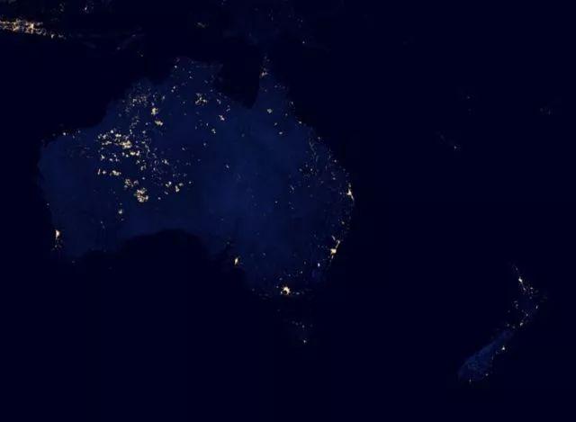 下圖是澳洲夜晚燈光圖,澳洲的城市經(jīng)濟(jì)活動集中在沿海城市(尤其是東南),以及閃爍異常的西澳大利亞內(nèi)陸(礦業(yè))。