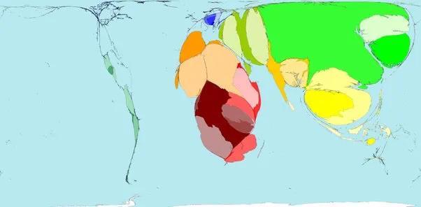 一張顯示2015年世界總財富的地圖。請注意,中國重新奪回了頭把交椅,印度緊隨其后。美國和歐洲大部分地區都在萎縮。在歐洲內部,俄羅斯急劇萎縮,而德國、意大利和法國的萎縮幅度較小。東南亞也有大幅增長(泰國、新加坡和印度尼西亞現在很大),而非洲和南美洲沒有變化。
