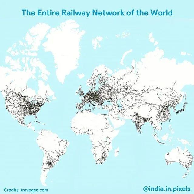 世界鐵路網,美國總里程25萬公里排第一,中國15萬公里排第二,但中國高鐵里程排第一,占比更大。