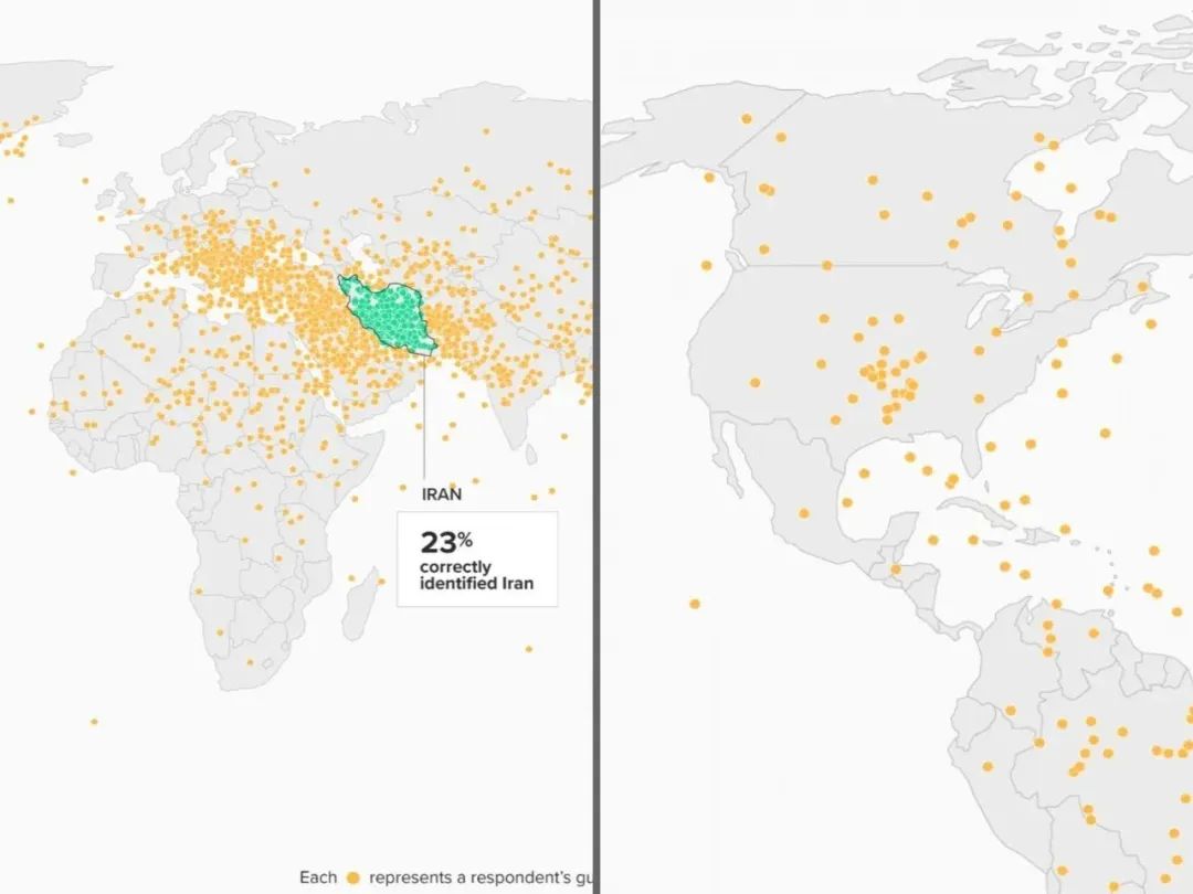 更離譜的是,美國人的眼中釘、肉中刺——伊朗,也只有23%的美國人知道在哪?甚至有不少人指向了美國本土…連自己國家在哪不知道…