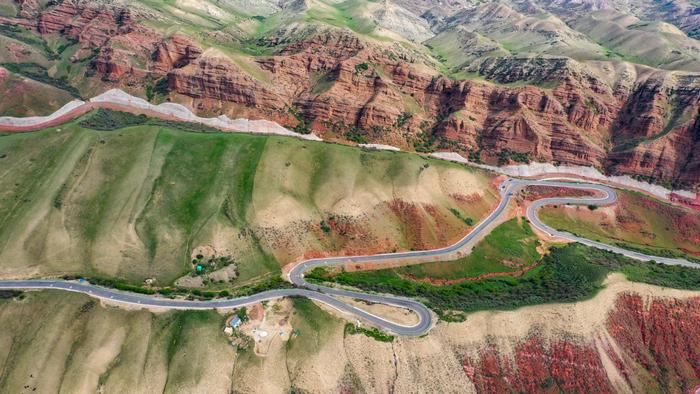 以上圖片:2023年5月13日,在新疆維吾爾自治區(qū)昌吉回族自治州境內(nèi)天山百里丹霞景區(qū),從空中俯瞰百里丹霞風(fēng)景道風(fēng)光如畫。CICPHOTO/陶維明 攝