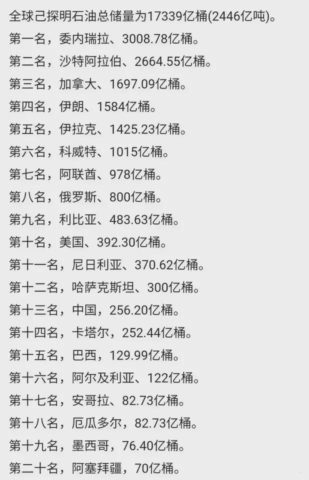 全球已探明石油總儲量國家前20排名,石油儲量最多的竟然不是阿拉伯國家,而是南美洲的委內瑞拉,不過石油儲量排名靠前的國家中有一半位于中東地區,可見該地區石油儲量之豐富,怪不得美國如急眼雞一樣死盯著這些國家不放,甚至頻繁發動軍事入侵。