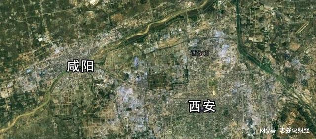 我們首先來看下西安和咸陽的地理位置。我截取了西安和咸陽的建成區衛星視圖,從這張圖片我們可以看到,西安市和咸陽市的建成區幾乎連在了一起。