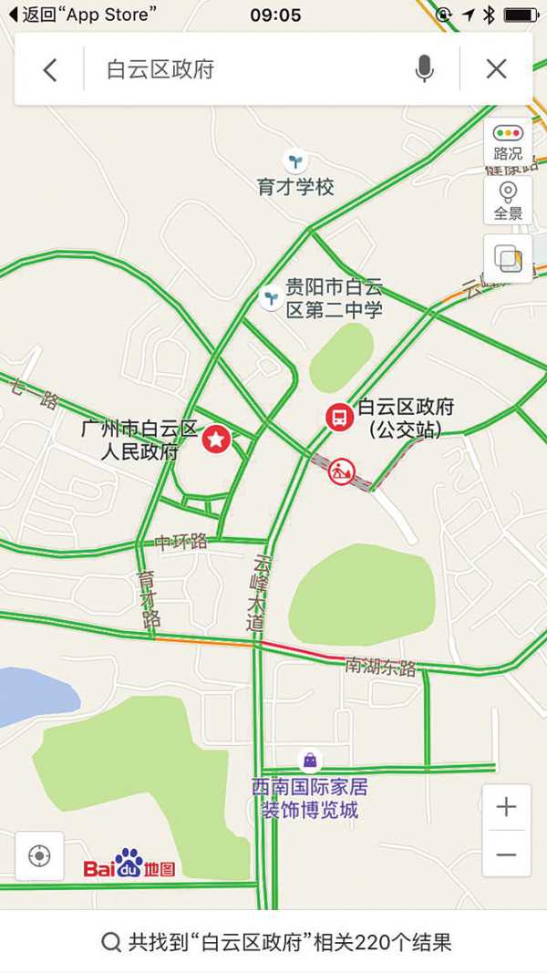 記者下載百度地圖APP后,軟件便自動定位到了貴陽市。記者在搜索欄輸入“白云區政府”,搜索的結果,與網友曬出的截屏一模一樣——原本是貴陽市白云區政府的位置上,顯示的卻是“廣州市白云區人民政府”。