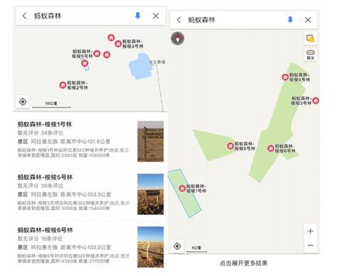 即日起,打開高德地圖搜索螞蟻森林,就可以看到支付寶用戶用手機種下的六片梭梭林。點開詳情,還有大量現場照片。