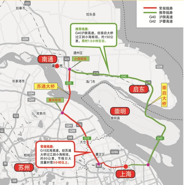 【推薦線路】:G40滬陜高速,選擇崇啟大橋過江,在上海境內五洲大道、上海長江隧道容易出現擁堵,出上海市區,基本暢通;