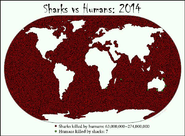 10. 2014年,人類共屠殺鯊魚數量為:63000000-274000000,人類死于鯊魚之口的數量為:7