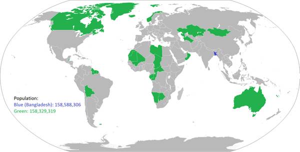 17.孟加拉國的人口數量和圖中的綠色區域的人口數量大致相同。