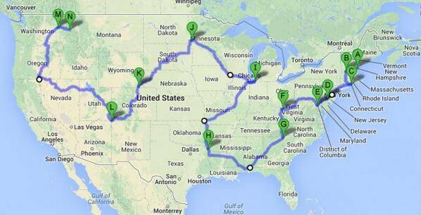 19.想要以最短的路線,走遍美國本土的48個州,下面是具體的路線。