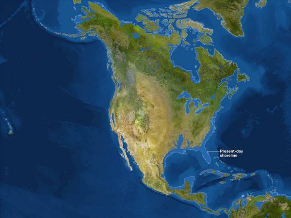 北美洲,整個佛羅里達半島全部沉浸在海水里。