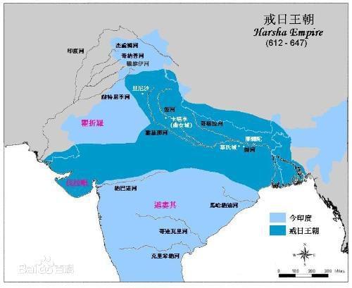 戒日帝國是從笈多團結后的一個小邦中開展起來的。7世紀初,戒日帝國(606-647)興起,啞噠人被逐,戒日王統一了北印度,建都曲女城。其版圖東到孟加拉灣,西迄旁庶普的簡直涵蓋了整個北印度。戒日王統治時正值玄奘訪印,他對玄奘給予很好的禮遇。