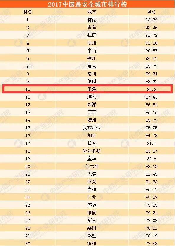 日前,在中國城市競爭力研究會發布的2017中國最安全城市排行榜上,玉溪第七次登上該榜單,排名第十,成我省唯一入選的城市。