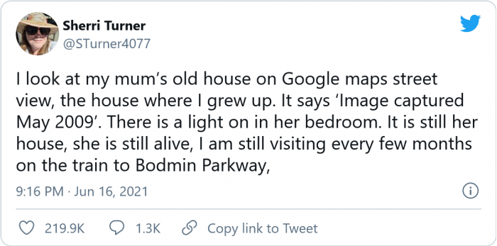 “我在Google地圖上看我媽媽的老房子所在的街景,這是我長大的房子。上面寫著“圖片拍攝于2009年5月”。她的臥室里亮著一盞燈。那仍然是她的房子,她還活著,我仍然每隔幾個月坐火車去博德明公園路。”